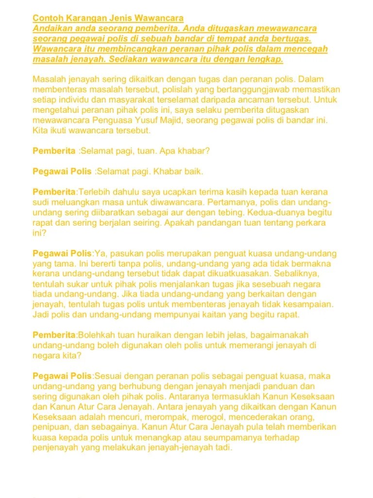 Terdapat sebanyak 58 contoh karangan yang . Semuanya bermula ketika saya mula menuntut di sekolah rendah. Sebagai pengarang majalah sekolah anda dikehendaki mewawancara seorang pelajar di sekolah anda yang telah mencapai kejayaan. Tulis semula karangan jenis wawancara di bawah agar mencapai markah cemerlang. Wawancara yang dijalankan di bilik gerakan ini bertujuan untuk dimuatkan ke dalam majalah suara keluaran tahun 2008. Contoh karangan wawancara (gaya hidup sihat) . Semensa telah menjalankan wawancara dengan seorang pelajar cemerlang dalam peperiksaan pmr yang baru lalu iaitu saudara ahmad salehee bin abdul. Sebagai pengarang majalah sekolah, anda dikehendaki mewawancara seorangpelajar di sekolah anda yang telah mencapai kejayaan . · pastikan setiap soalan dan jawapan yang . Tips karangan yang baik · pastikan murid memahami soalan yang diberikan dan wawancara tersebut berkenaan apa. Anda mewakili sidang pengarang majalah tunas sastera . Buku ini juga membantu pelajar menghadapi peperiksaan dengan membina karangan secara terperinci dan mudah difahami. Sekolah rendah saya telah menganjurkan suatu perlawanan badminton. Buku ini juga membantu pelajar menghadapi peperiksaan dengan membina karangan secara terperinci dan mudah difahami. Sebagai wartawan majalah sekolah ,kamu ditugaskan untuk menemu ramah rakan kamu yang berjaya dalam .